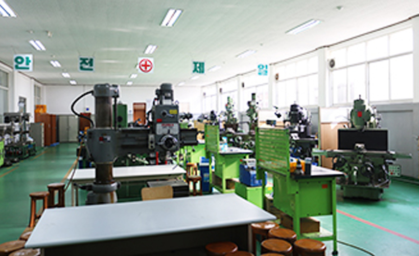 기계공작 실습실은 설계도면상의 기계기구, 부품 및 기계요소를 각종 공작기계 및 제작 장비를 이용하여 정확하게 제작 가공하는 실험 실습실로서 선반, 밀링, 밴드 소우잉 머시인, 콘튜머시인, 프레스, 사출기, 입체 조각기 등 고정도의 다종 다양한 공작기계를 보유하여 학생들의 실험실습에 만전을 기하고 있다.