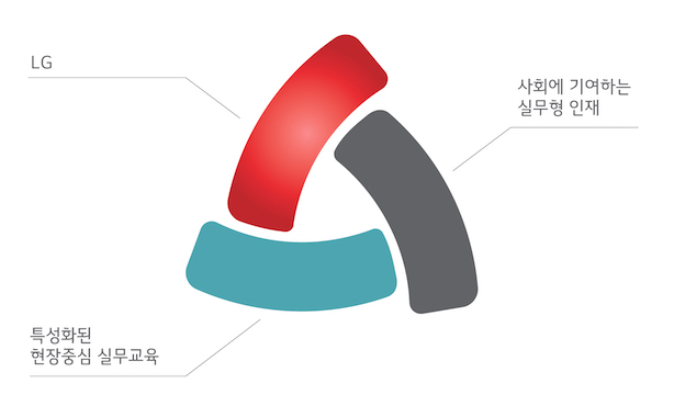 - 삼각형 형태의 세가지 요소와 색상은 각각 LG, 특성화된 현장중심의 실무교육, 사회에 기여하는 실무형 인재를 의미합니다.