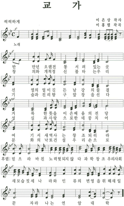 창의와 개척정신 불타는 우리기술과 진리탐구 앞장을 선다성실과사랑으로 한데뭉치어문화의 낙토건설 우리손으로
